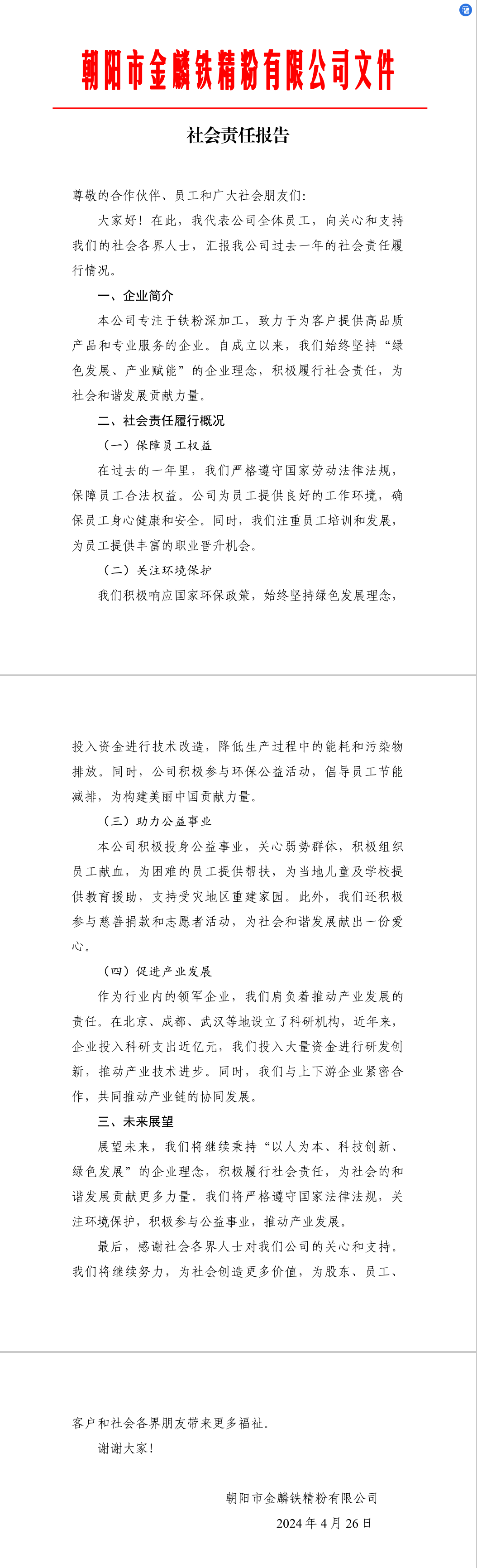 展望未來,我們將繼續(xù)秉持“以人為本、科技創(chuàng)新、綠色發(fā)展”的企業(yè)理念,積極履行社會(huì)責(zé)任,為社會(huì)的和諧發(fā)展貢獻(xiàn)更多力量。我們將嚴(yán)格遵守國(guó)家法律法規(guī),關(guān)注環(huán)境保護(hù),積極參與公益事業(yè),推動(dòng)產(chǎn)業(yè)發(fā)展。